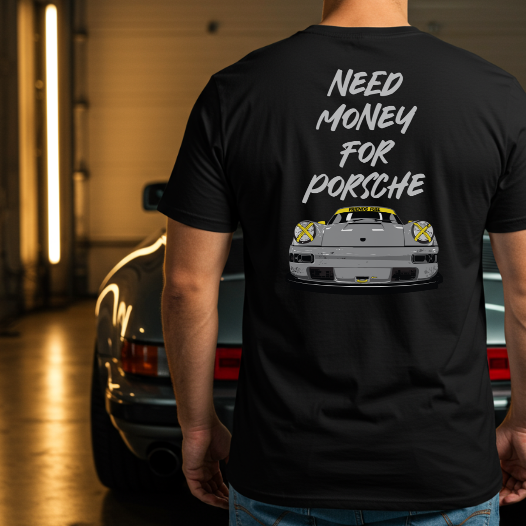 Você é apaixonado por carros e velocidade? Então esta camiseta é para você! Com um design exclusivo desta Porsche 911 (964), traz a frase "NEED MONEY FOR PORSCHE" em destaque, acompanhada de uma ilustração com detalhes incríveis como as faixas amarelas "FRIENDS FUEL" e os faróis cruzados.