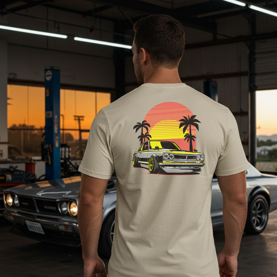O apelido HakoSuka vem da fusão das palavras japonesas "Hako" (caixa) e "Suka", uma abreviação de Skyline. Essa referência é um tributo ao design quadrado e musculoso do Skyline GT-R dos anos 70, um verdadeiro ícone das pistas e precursor da lenda GT-R. A estampa Sunset captura a essência desse clássico sob um pôr do sol vibrante, destacando suas linhas agressivas e a alma rebelde que fez história no automobilismo.
